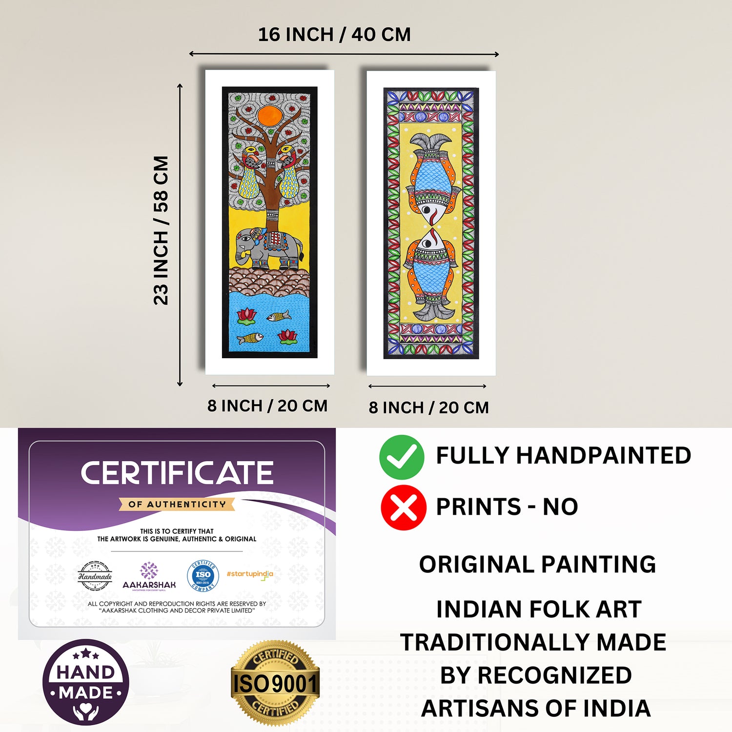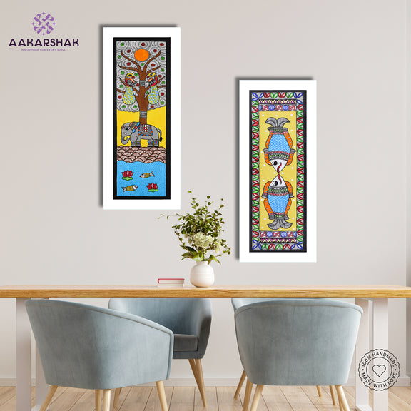 Handmade Madhubani Painting Set of 2 – Elephant & Fish Wall Decor 8x23