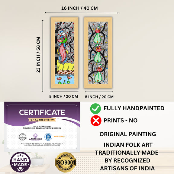Handmade Madhubani Painting Set of 2 – Peacock and Peacock Wall Decor 8x23