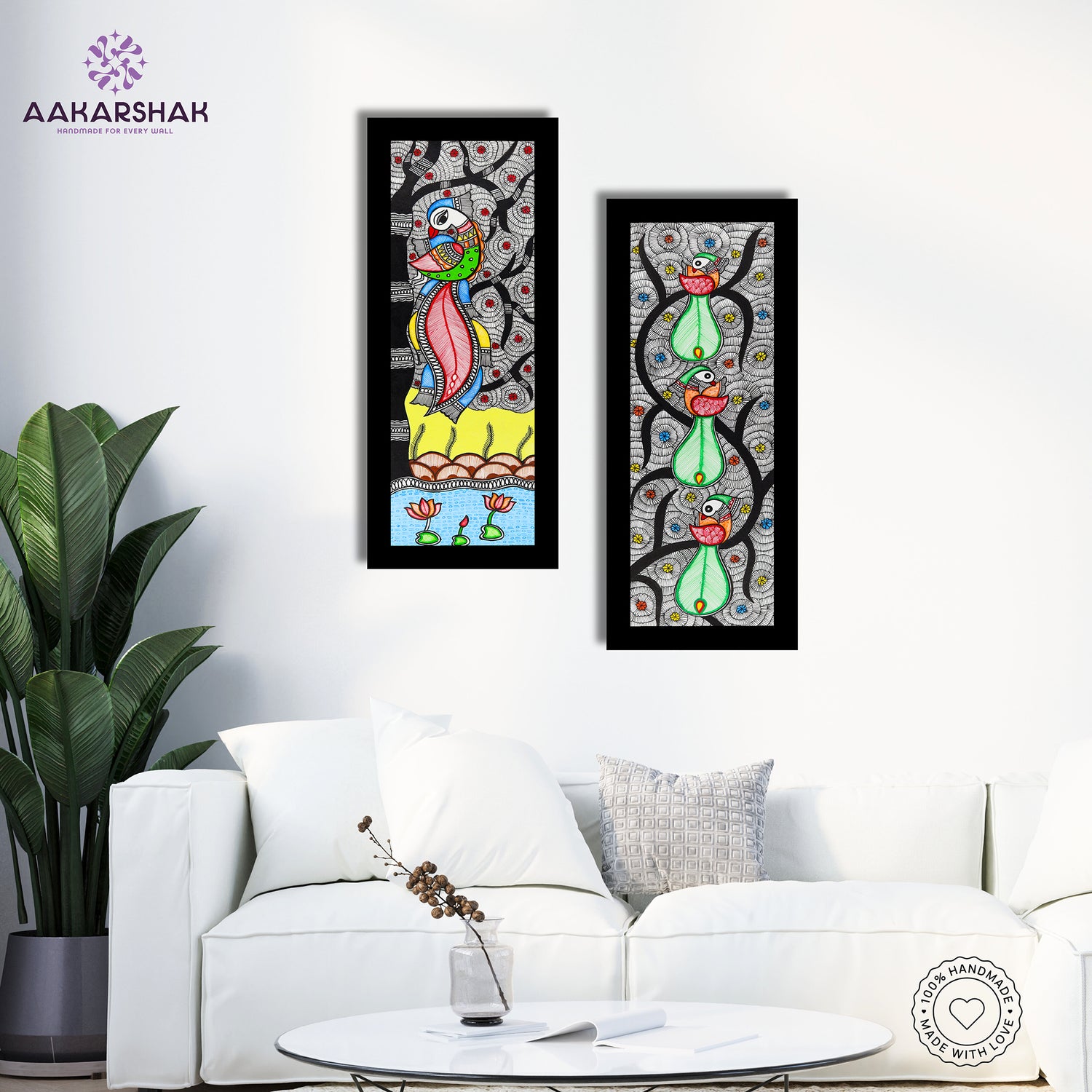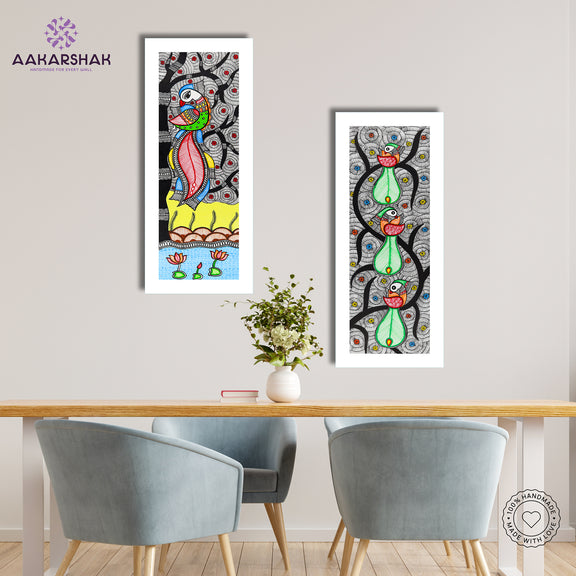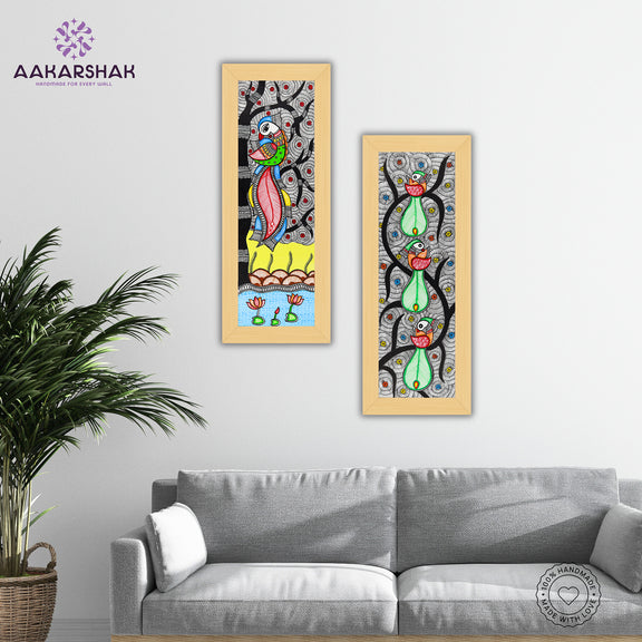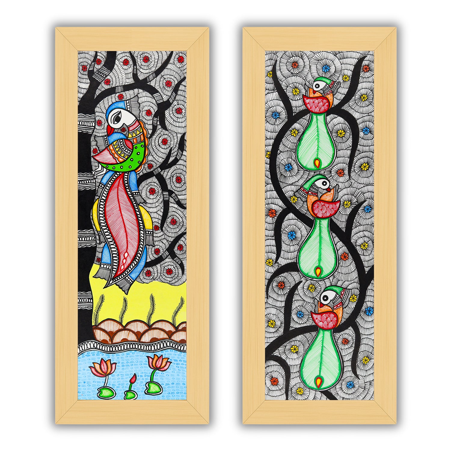 2 Framed Madhubani Painting Set (Peacock and Peacock)