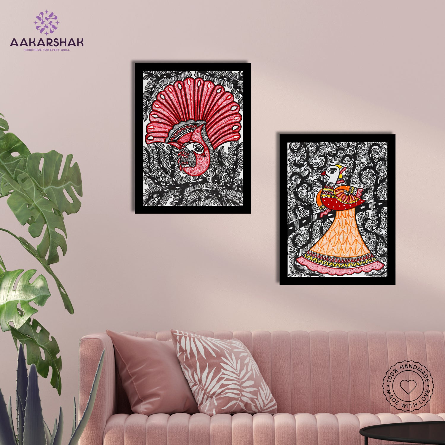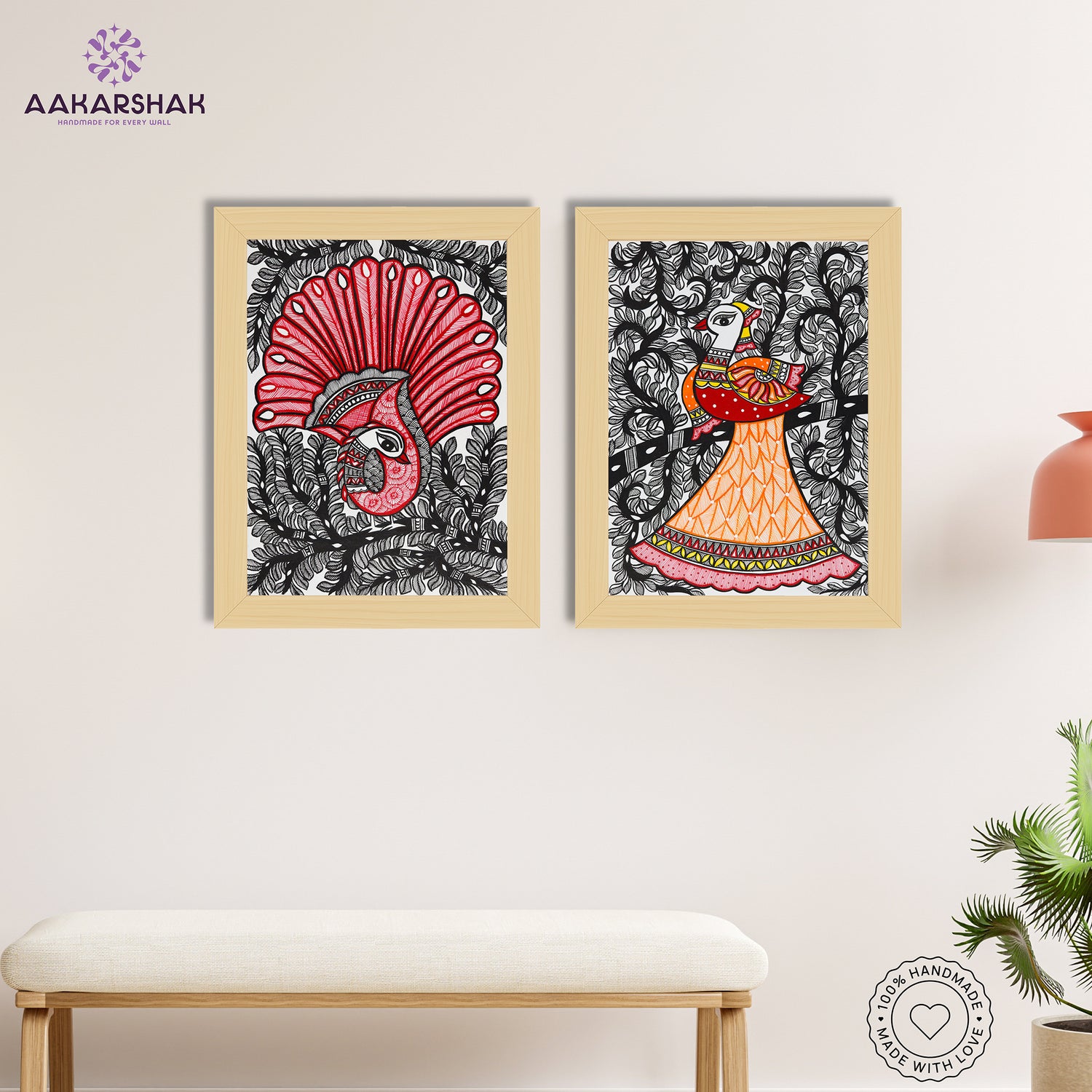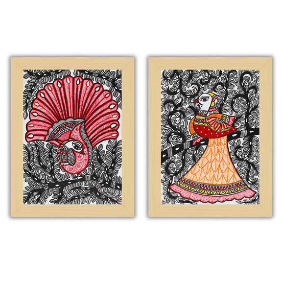 2 Framed Madhubani Painting Set (Dancing Peacock)
