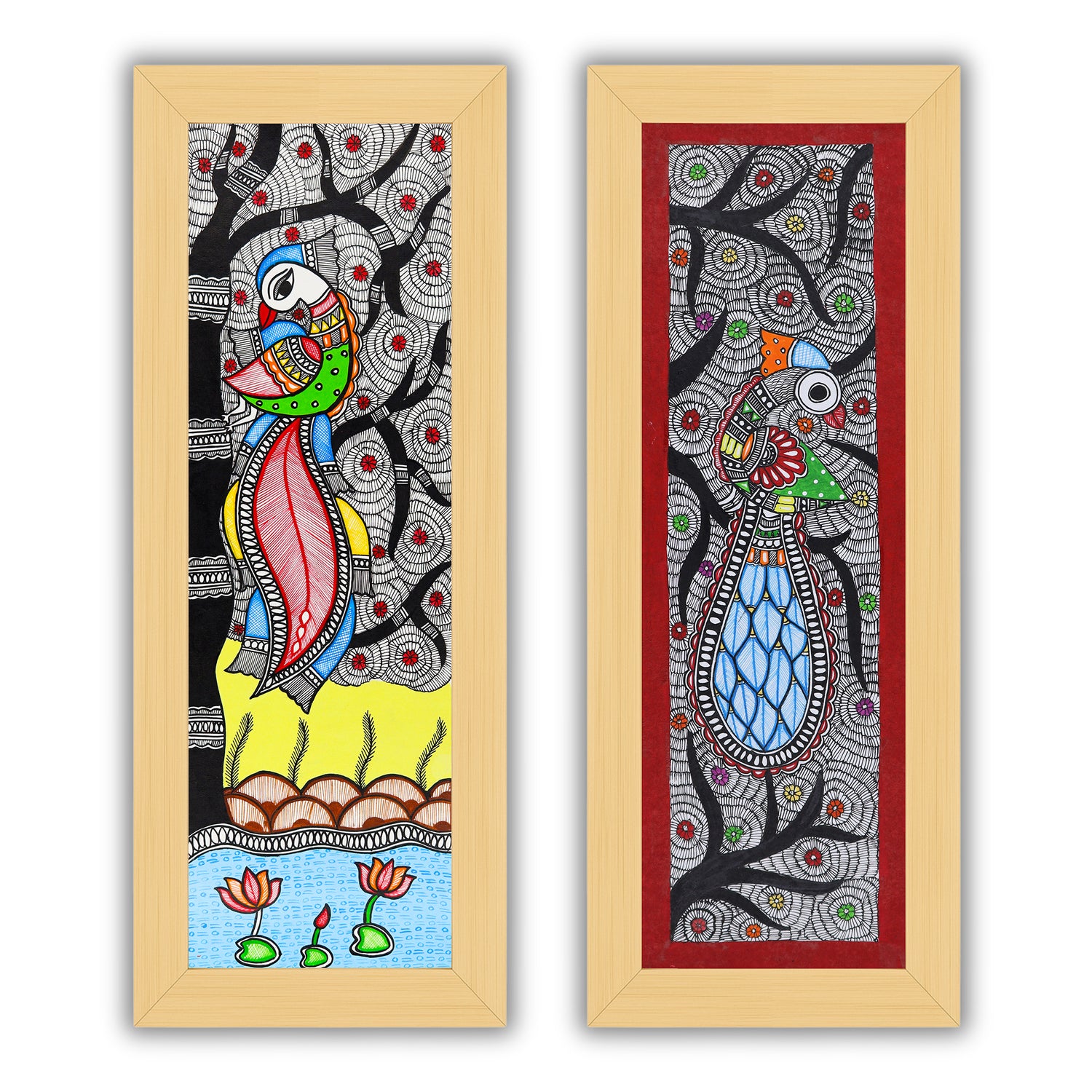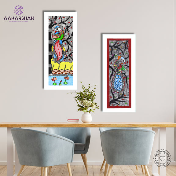 2 Framed Madhubani Painting Set (Peacock and Peacock)