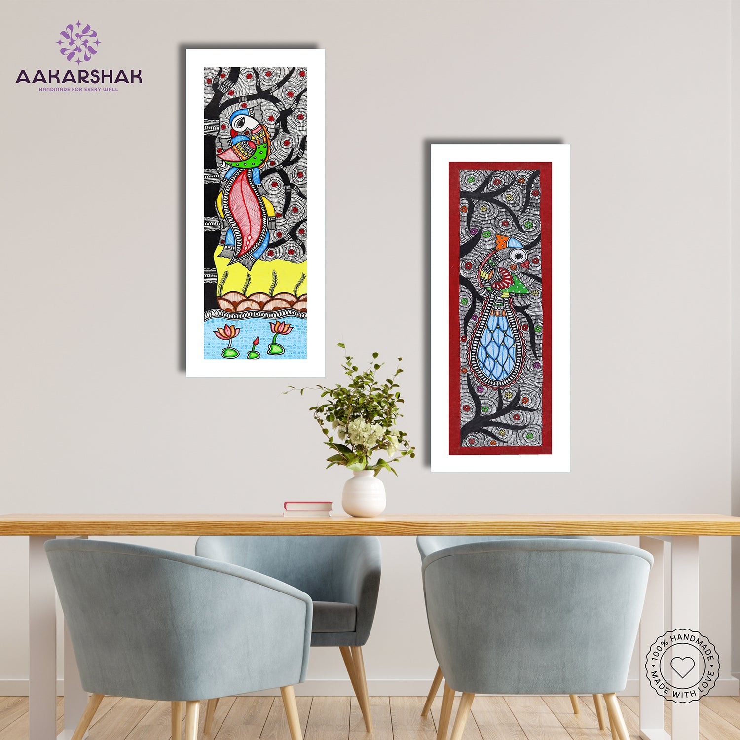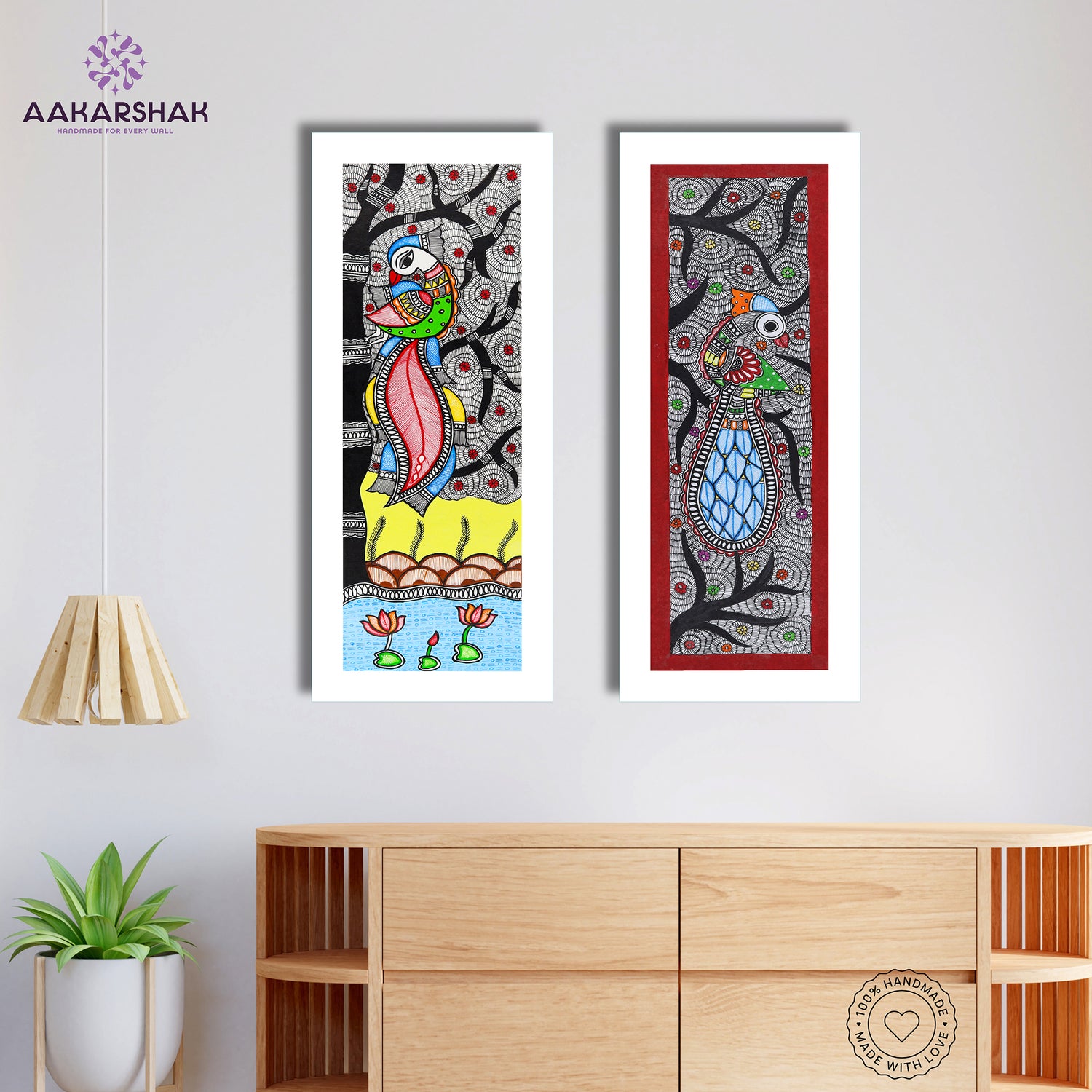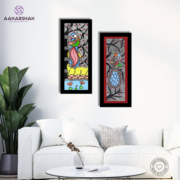 Bring tradition to your space with this vibrant, hand-painted Madhubani Peacock and Peacock Combo