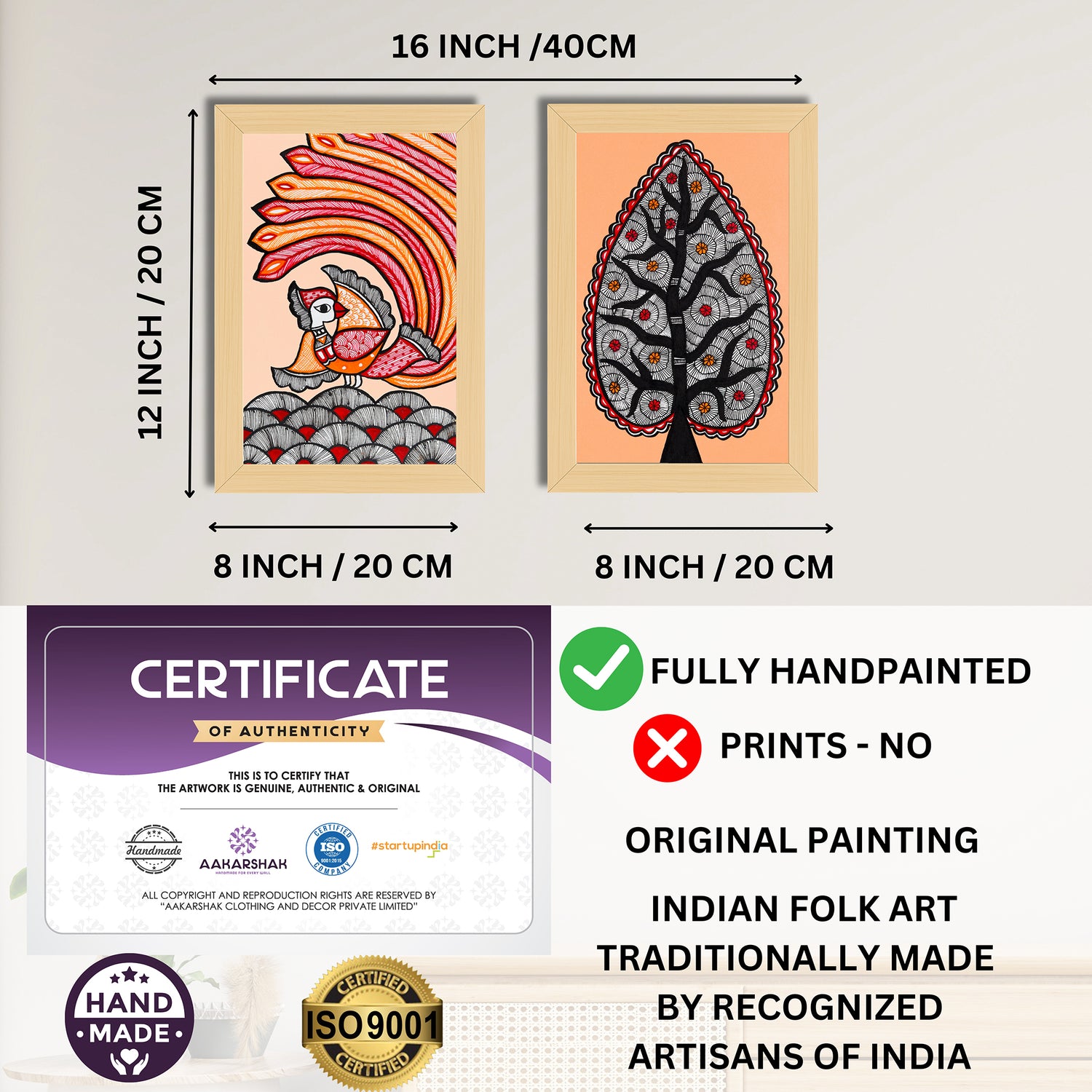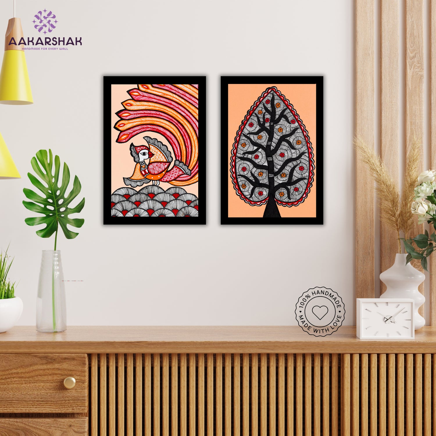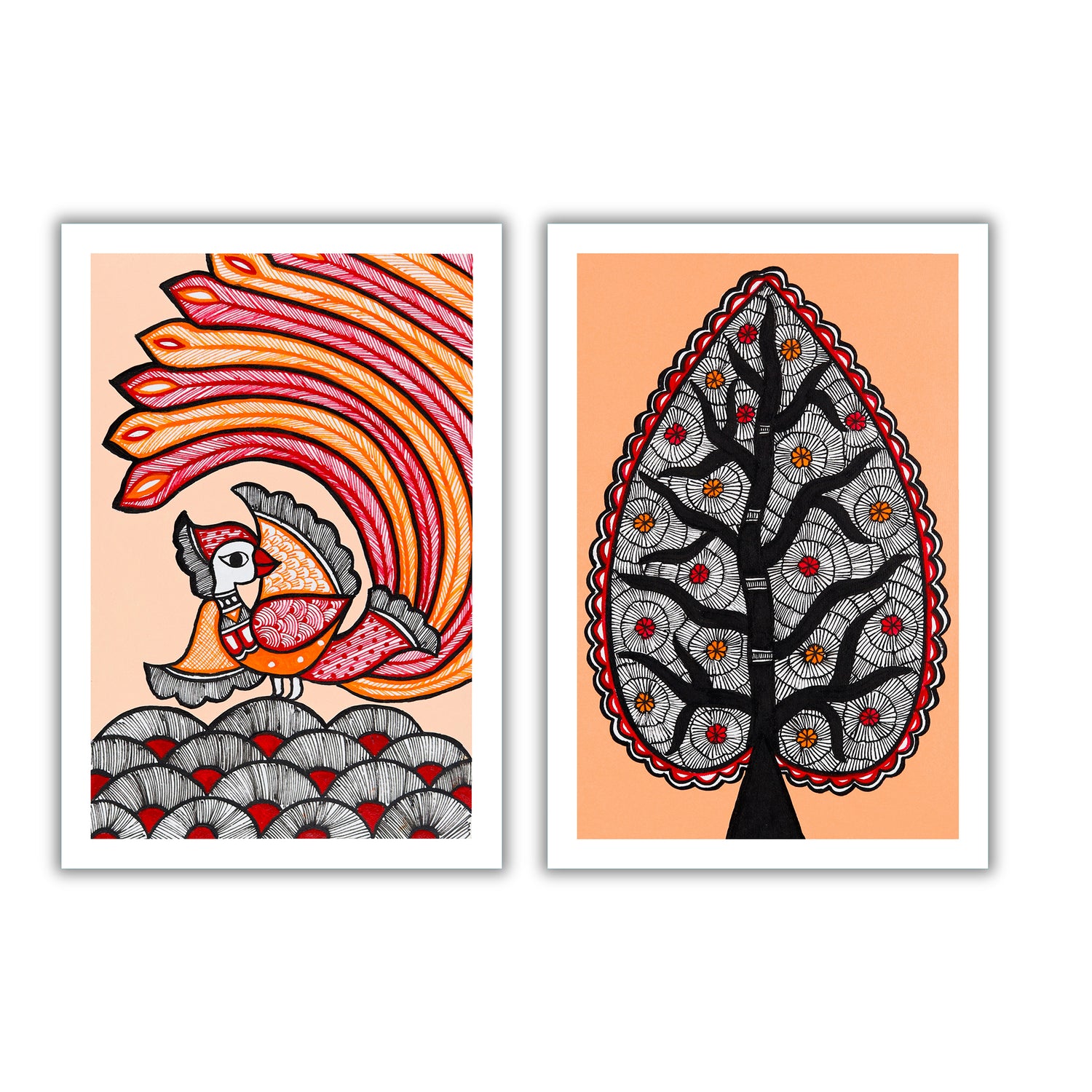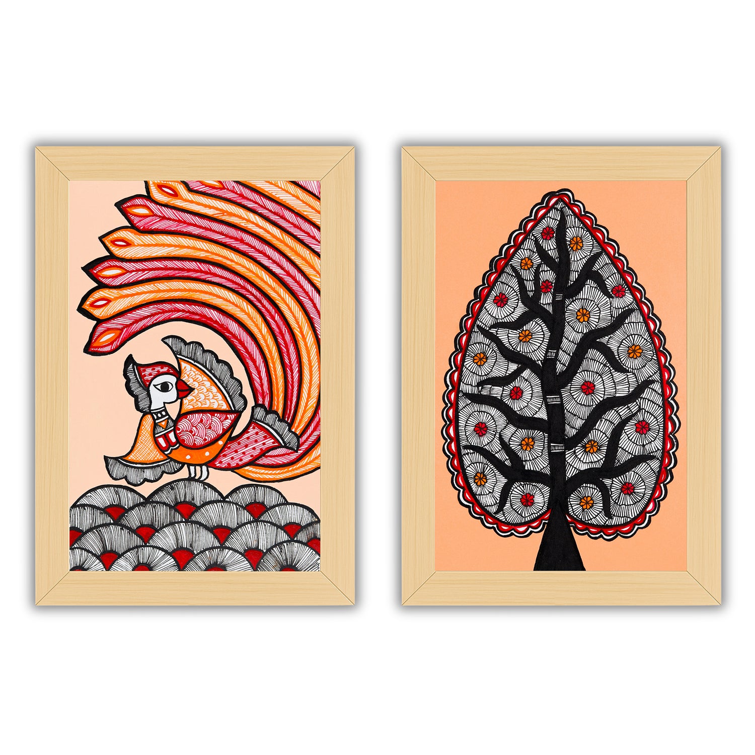 2 Framed Madhubani Painting Set(Peacock and Tree of life)