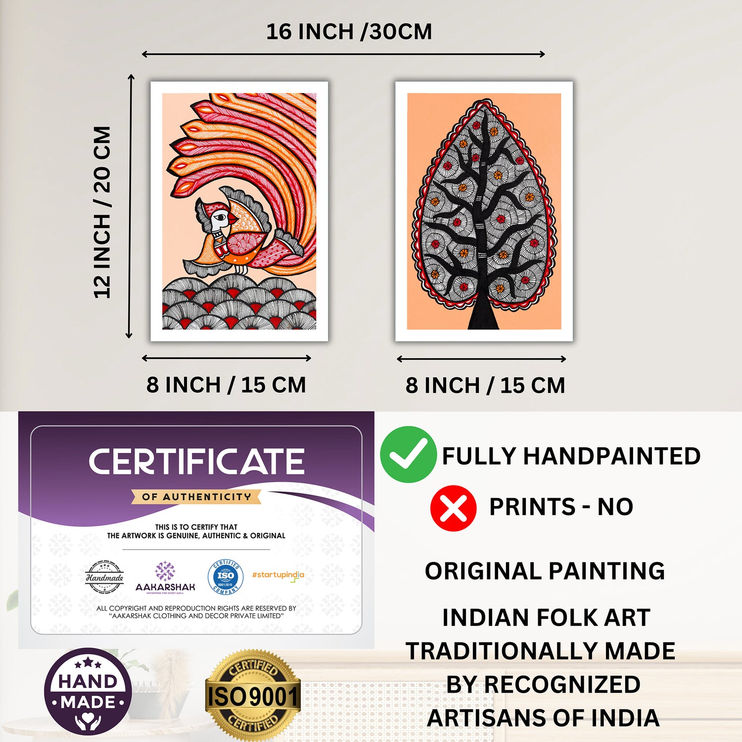 🖌️ Premium Handmade Madhubani Peacock and Tree of life Combo Painting – 8x12 Inch