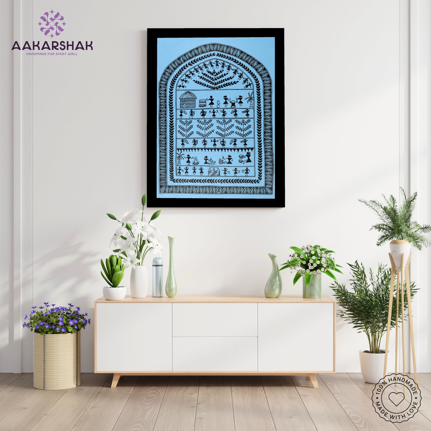 Celebrate tribal heritage with this handcrafted Warli painting, depicting a vibrant village scene. Rooted in the Sahyadri region of Maharashtra, this artwork reflects the harmony between humans and nature through minimalist yet powerful motifs.